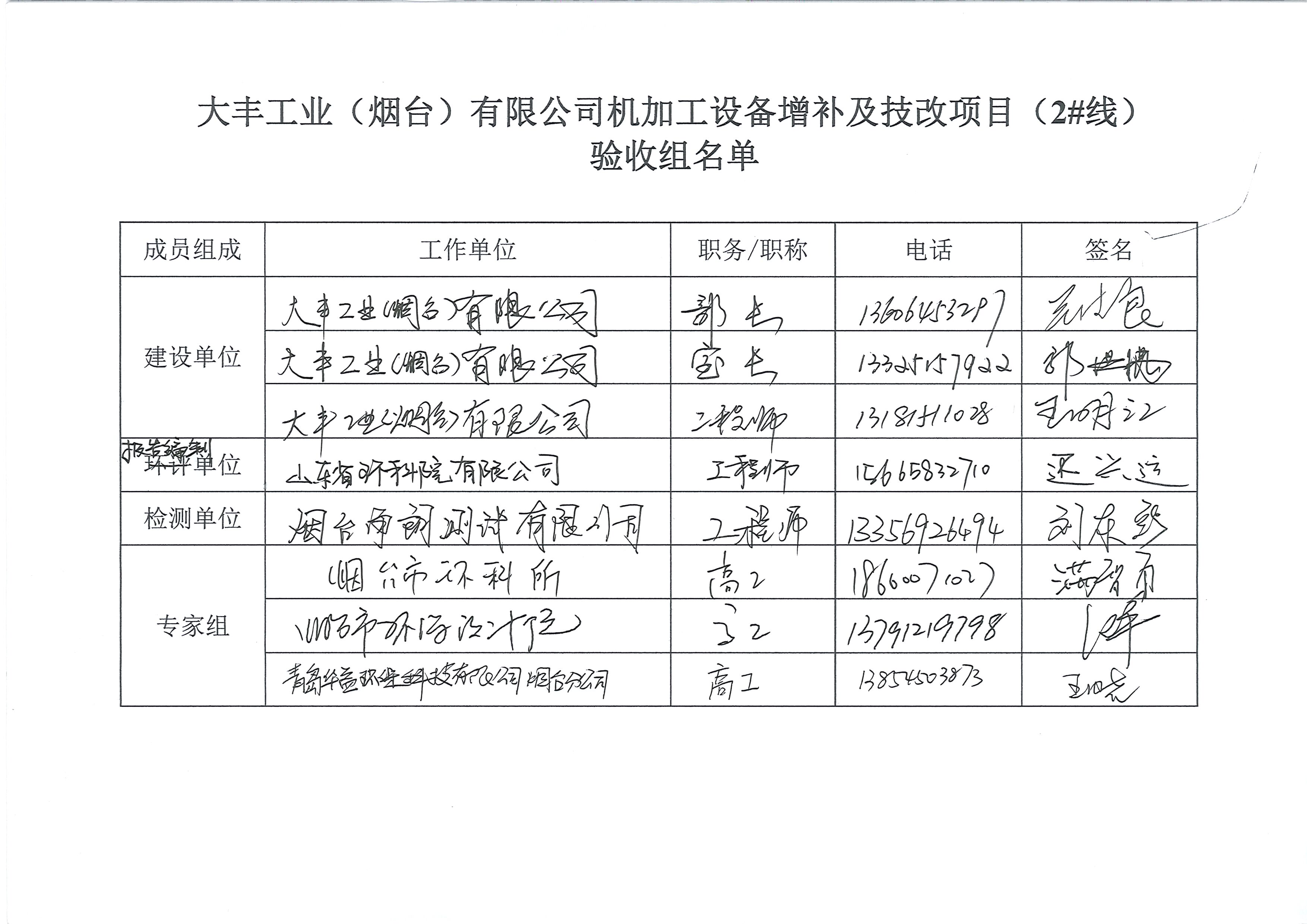大豐工業(yè)(煙臺(tái))有限公司機(jī)加工設(shè)備增補(bǔ)及技改項(xiàng)目(2#線)驗(yàn)收組名單